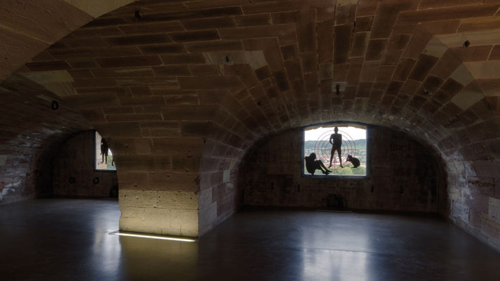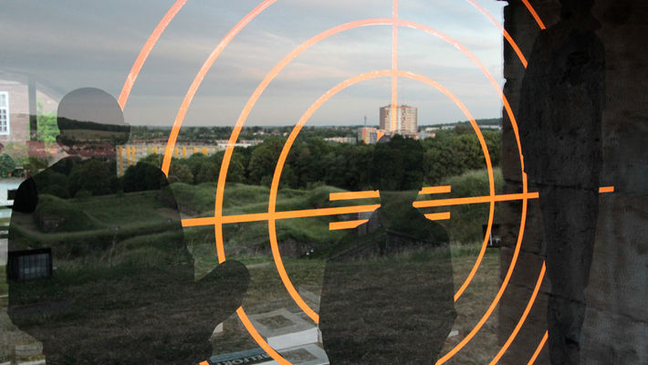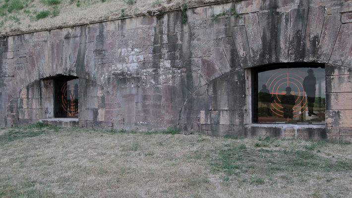 Les quatre ouvertures de tir dirigées sur l’arrière de la citadelle sont occupées par des découpes de silhouettes humaines visées par une mire de grande taille. Ainsi investies, ces ouvertures ne sont pas seulement le support à une composition qui pourrait renvoyer à la peinture ou à la photographie, mais elles deviennent le cadre d’une mise en scène questionnant davantage le champ de la sculpture, et en particulier celui de la sculpture contemporaine. Les figures représentées sont en effet toutes extraites de sculptures figuratives d’artistes contemporains – de Duane Hanson à Xavier Veilhan, en passant par Maurizio Cattelan ou Ron Mueck – dont la particularité est de présenter des postures variées, et d’être sans socle et en ronde-bosse. L’intervention leur fait subir un certain nombre de glissements. Tout d’abord un glissement formel, puisque la tridimensionnalité des œuvres ainsi que leur matérialité sont ici « mises à plat », elles ont perdu leurs couleurs, leurs textures et leurs volumes d’origine. Leur unité monochrome les rassemble et semble les faire appartenir à un même groupe mis en situation dans un nouveau contexte. Les sculptures d’origine voient également leur échelle métamorphosée, ramenée à l’échelle du lieu, et formant un ensemble cohérent – par exemple Him, de Maurizio Cattelan est à l’origine de taille réduite, tandis que l’œuvre de Ron Mueck est monumentale. Enfin, elles deviennent ici les protagonistes d’une installation dans laquelle le recours aux deux dimensions sert d’autant mieux la profondeur de la mise en espace. Car elles sont avant tout placées dans la ligne de mire du spectateur pour qui les silhouettes font partie intégrante du lieu, visibles depuis l’intérieur, les batteries de tir Haxo, et depuis l’extérieur, les Glacis. Inscrites dans le paysage, elles opèrent le lien entre l’intérieur et l’extérieur, entre le proche et le lointain et élargissent le champ du réel et de l’imaginaire à travers celui de la sculpture elle-même.